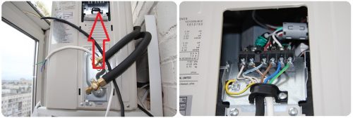 Kurulum teknolojisine göre, klimanın gücü ayrı bir makineye gitmeli ya da herhangi bir elektrikli ev aleti gibi, fişli bir ağ kablosu tercih ederek normal bir prize bağlanmalıdır. Dağıtım fırçasındaki gerekli devre kesiciyi kapatın ya da fişi prizden çekin. Altında filtrelerin bulunduğu iç ünitenin ön panelini açıyoruz. Filtrelerin sağında küçük bir kapak var. Bir tornavida tercih ederek, bu kapağı sökün ve çıkarın, altında bölünmüş sistemin iç ve dış üniteleri içerisinde bir bağlantı oluşturan bağlı tellere sahip bir blok mevcuttur.